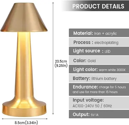 مشخصات محصول را در تصویر زیر مشاهده کنید. جنس بدنه آن از آهن و آکرلیک است که زیبایی خاصی به آن داده است. نور این محصول LED است و همچنین باتری 5000mha این امکان را به شما میدهد که حدودا 15 ساعت از آن استفاده کنید.